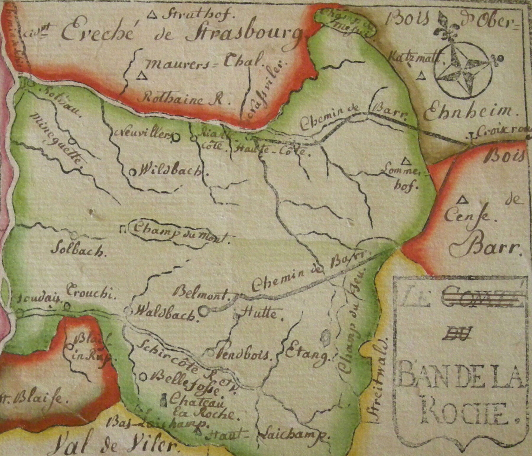 Quelle: Carte muette du Ban-de-la-Roche (Alsace), gravée sur bois par le pasteur Jean-Frédéric Oberlin en 1776. Le mot comté a été barré sur cette carte après la Révolution.
